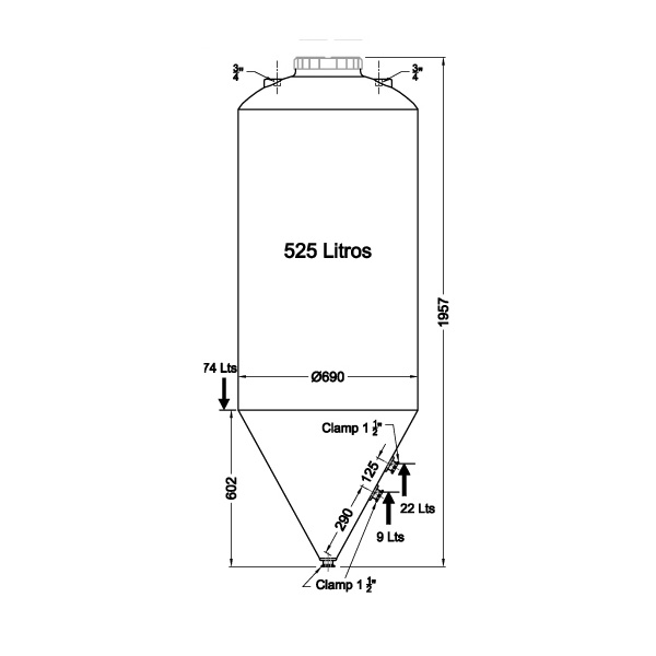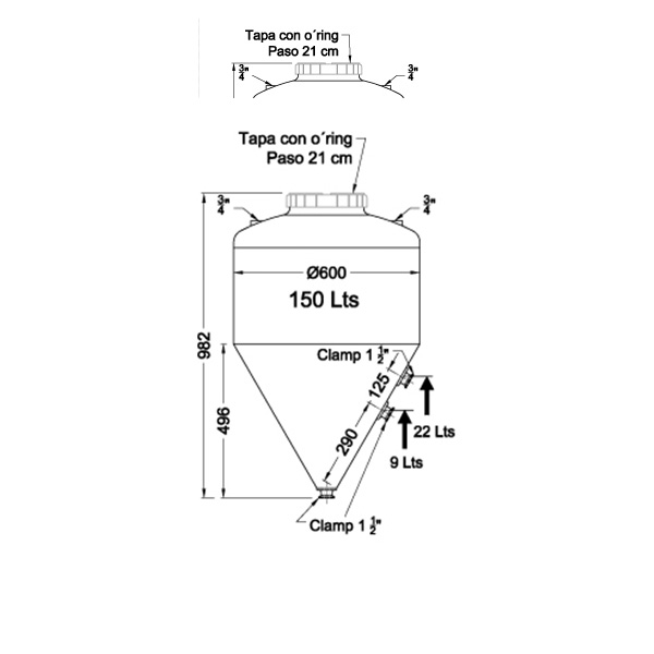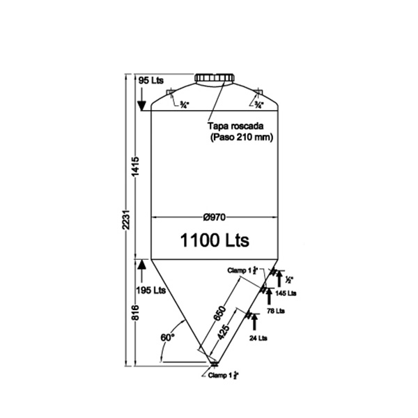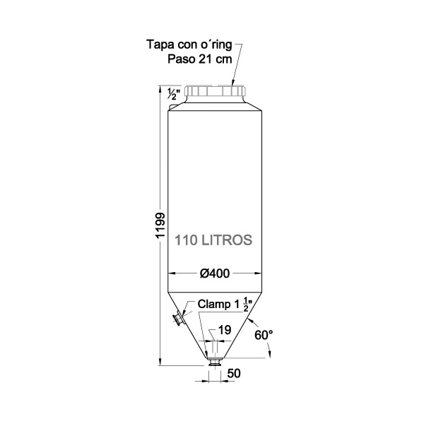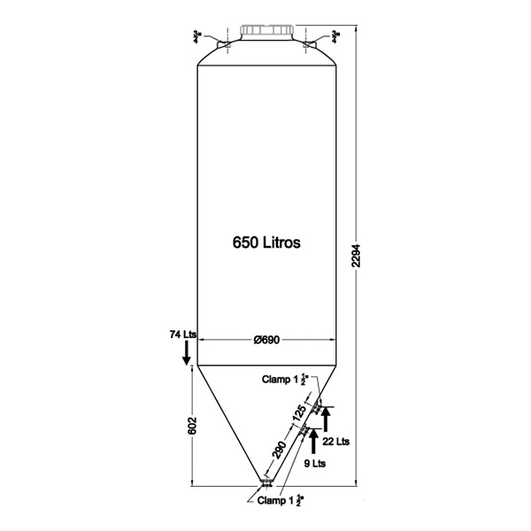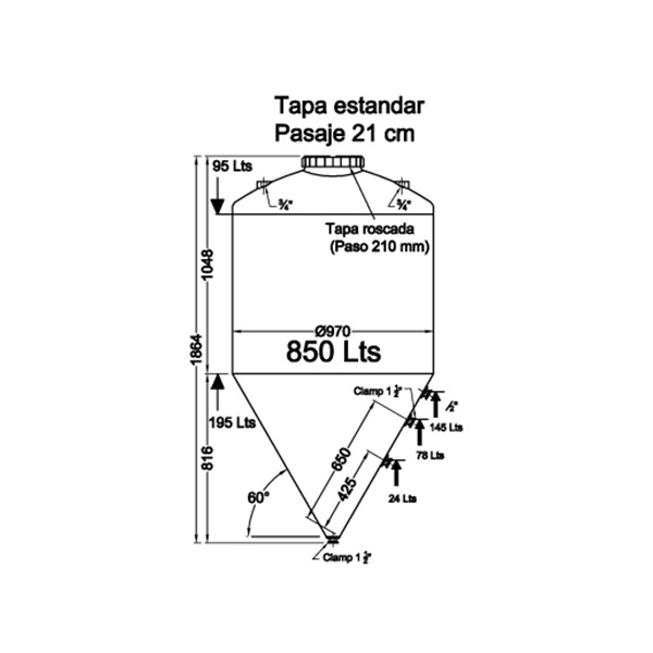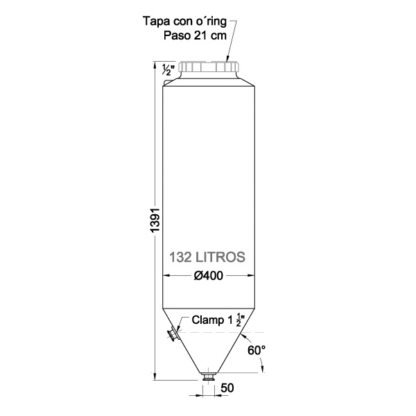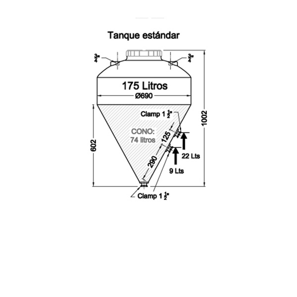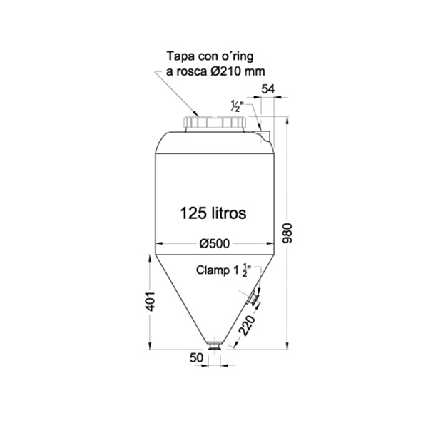 Poseen un tubo principal de 4″ y dos tubos de 13mm de diámetro enroscados en la punta (rosca BSP 1⁄4) donde se debe conectar el abastecimiento del fluido. Incluyen la vaina con conector para colocar el sensor de temperatura. Tapa en la que va ensamblado, verde a rosca o blanca con 10 insertos.